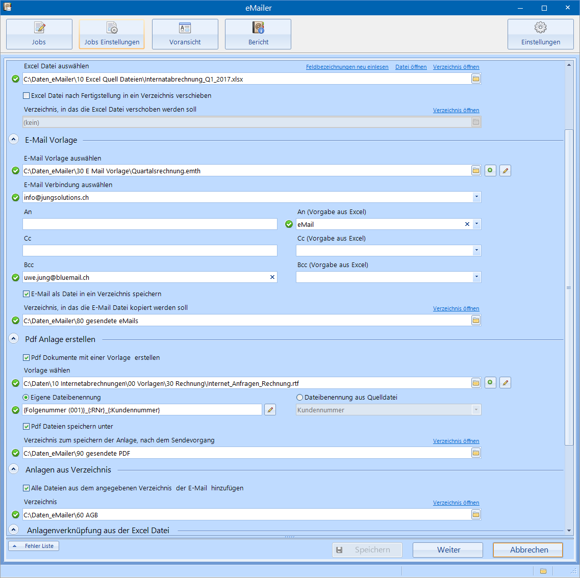 Diese Möglichkeit ist das enorme Plus des eMailers. Solange die verwendeten Daten in einer Excel-Datei gespeichert sind, kann der definierte Job immer wieder benutzt werden. Lediglich der Dateiname muss in der Konfiguration angepasst werden. Hat die Excel-Datei immer denselben Namen und befindet sich an der ursprünglichen Stelle, muss in diesem Fall keine Änderung vorgenommen werden.